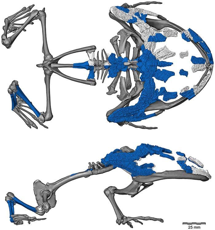 Und seit der Entdeckung der ersten Fossilien wurden bisher etwa 75 Fossilstücke gefunden, und fast der gesamte Körper und Schädel dieses riesigen Frosches kann rekonstruiert werden.